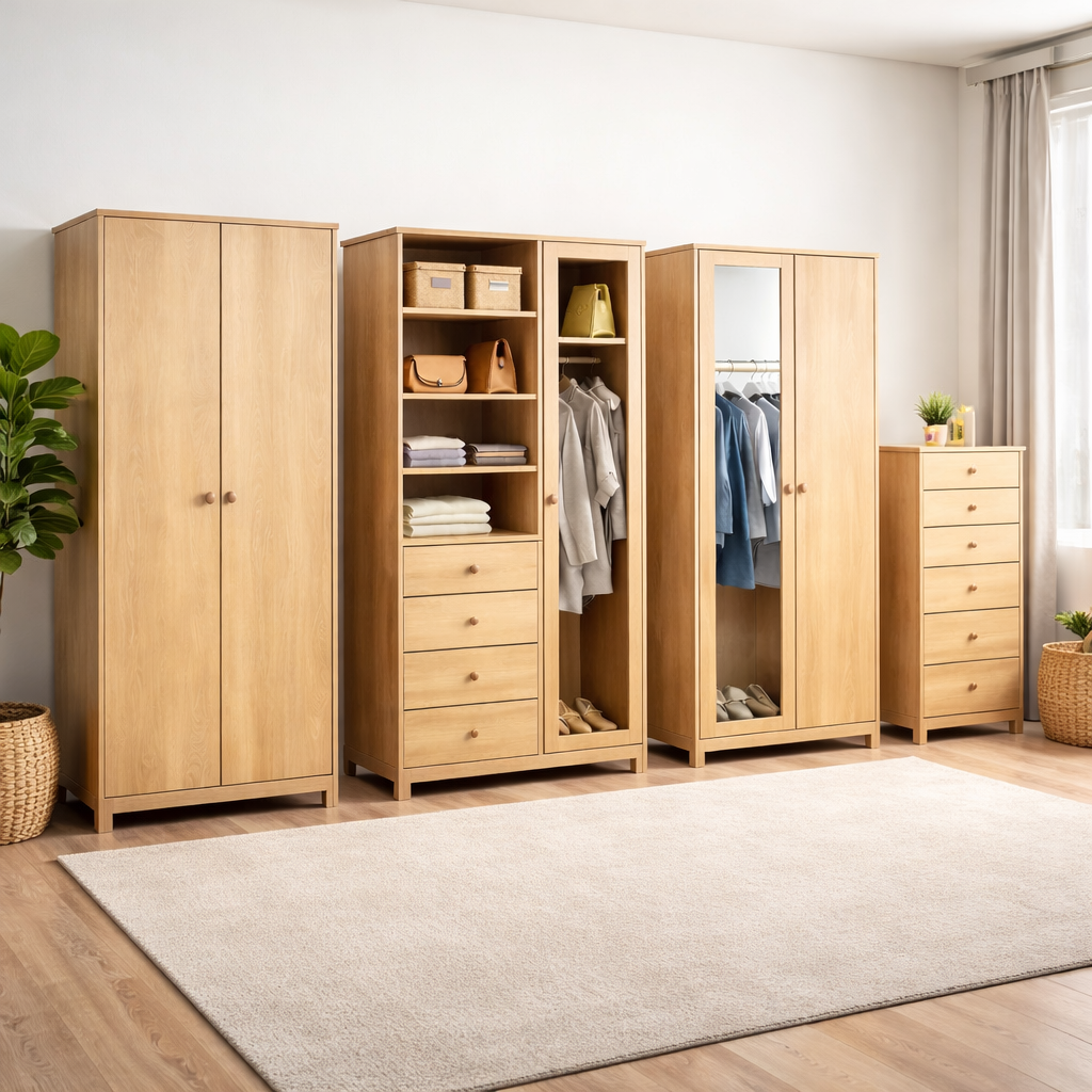Dieser Kleiderschrank besticht durch sein dunkles Holzmaserungsdesign und wirkt insgesamt ruhig und elegant. Er kombiniert offene und geschlossene Elemente und dient so sowohl der Präsentation als auch der Aufbewahrung von Kleidung, Accessoires und Alltagsgegenständen, sodass diese ordentlich verstaut werden können.